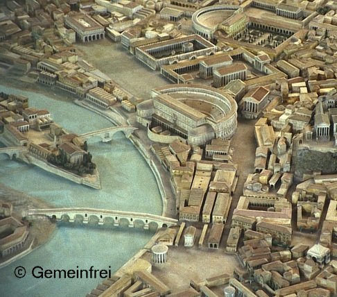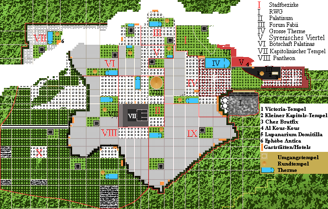 Schauen wir uns die Hauptstadt noch einmal von Oben an: Die sanfte Biegung des Ephèbe-Flusses, die Schiffsinsel in der Mitte des Flusses (so genannt, weil sie in Form eines antiken Kriegsschiffes umauert wurde), dass Callistus-Theater (das Halbrund in der Mitte), die Foren und Tempel, die weiten Grünanlagen, die Basiliken und Tempel, die Schauplätze historisch wichtiger Entscheidungen und Begebenheiten, alte und neue Bauten; schauen wir auf das pulsierende Herz des Vielvölkerreiches!