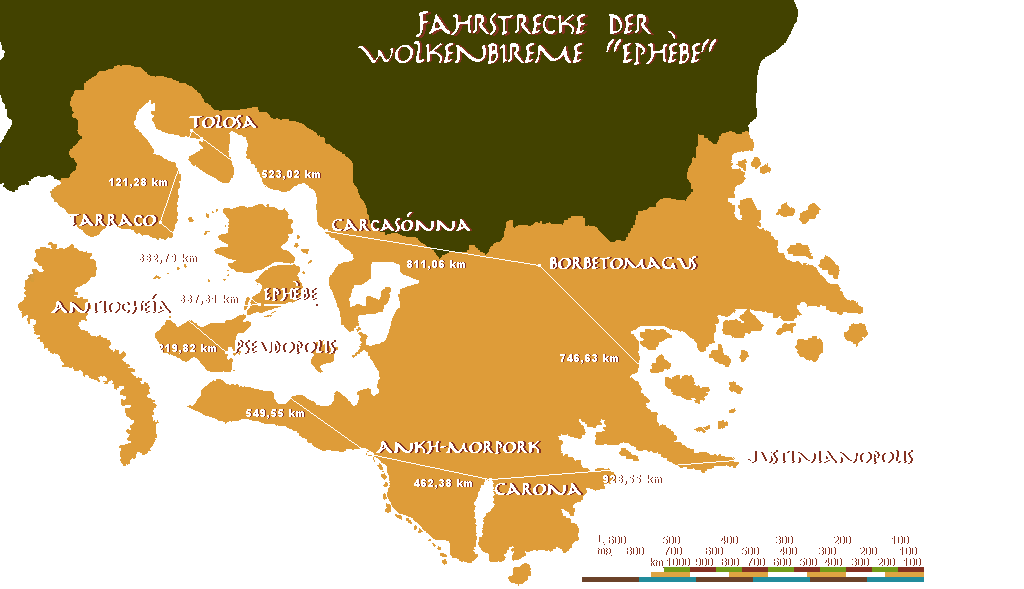 Eine mögliche Reiseroute, beginnend in Ephèbe-Stadt