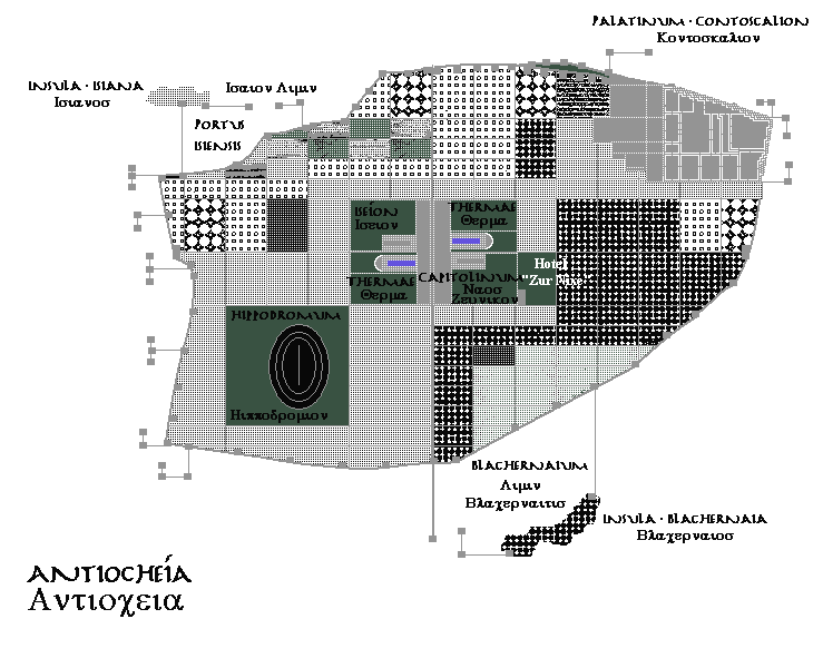 Einige von ihnen sind sehr Mineralhaltig und gelten mit Recht als Heilquellen, was eine der Vorfahinnen der regierenden Königin, Königin Arsinoé III (Reg.: 2613-2622 A.U.C. , 1860-1869 n.Chr.) dazu veranlasste, die Stadt zur Residenz Syrenes neben der eigentlichen Hauptstadt Pseudopolis zu erklären, wobei anzumerken bleibt, dass Antiocheía bereits in der Vergangenheit einmal Hauptstadt des Königreiches war, solange, bis im Jahre 876 a.u.c./123 v.Chr. Pseudopolis zu Syrene kam, dass als Aussenhafen des Königreiches günstiger zum aufsteigenden Ephèbe lag.
