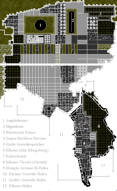 Und natürlich zeigt Pseudopolis alle merkmale ladinischer Städte: Amphitheater, Hippodrom, ein großes, Saepta Basilissa Barsine genanntes Einkaufszentrum, den Palst der Königin, den Kibotos, der der Altstadt seinen Namen gab, aber eben auch die beeindruckenden Getreidespeicher.