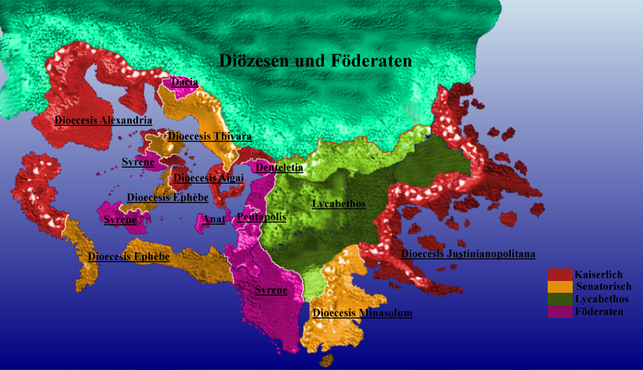 Die Provinzen werden vielfach, sowohl vom Senat als auch vom Kaiser in die Obhut des regionalen Adels gegeben und entsprechen in ihrer Bedeutung den Regierungsbezirken anderer Staaten. Wesentlich bedeutsamer für die Verwaltung des Reiches sind die Diözesen (im eturäischen, der zweiten Staatssprache werden sie Eparchie, ἐπαρχία genannt), die jeweils mehrere Provinzen umfassen.