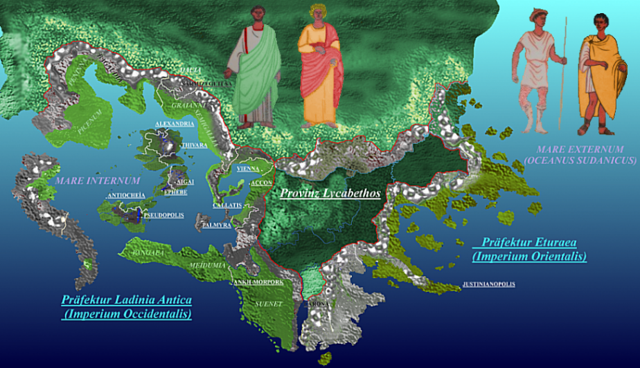 Das Imperium ist traditionell in drei große Bereiche geteilt: Den Westen, welcher die Länder und Provinzen des Mare Internum umfasst, die Präfektur Ladinia Antica; in den Osten unter dem Namen Präfektur Eturäa mit der Hauptstadt Justinianopolis, welcher dem Sudanik und dem Seehandel zugewandt ist und in die Großprovinz Lycabethos, Heimat gallo-ladinischer Stämme, die weitestgehend autonom leben. Die Hauptstadt der Provinz (und gleichzeitig einzige größere Stadt des gesamten Gebietes Lycabethos) ist Carona am gleichnamigen Golf, tief im Süden der Großprovinz gelegen.