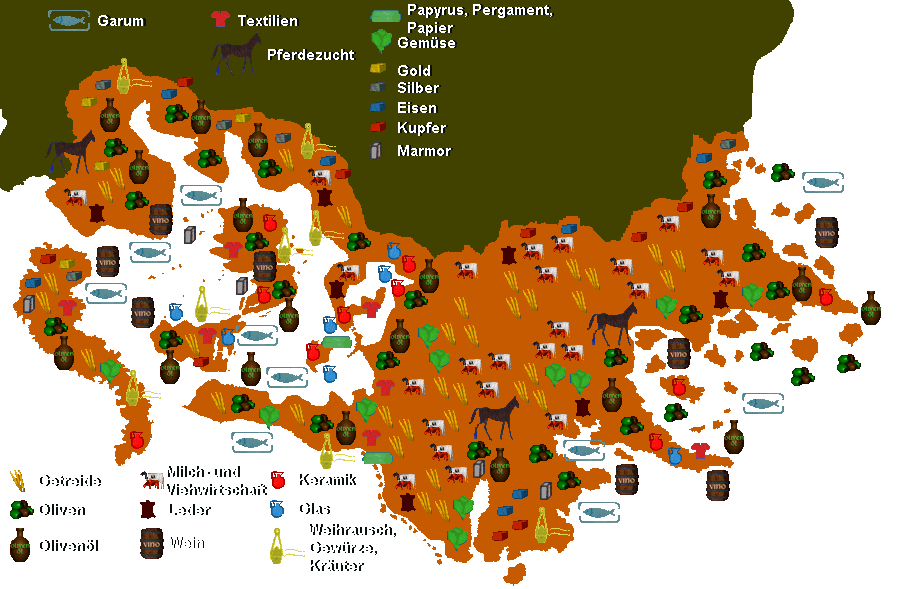 Ohne Angabe von Herkunftsorten oder Städten werden bewusst nur die Anbau- und Herstellungsgebiete dargestellt, denn die Lehrer fordern die Schüler dazu auf, eben jene Gebiete und Städte, die Provinzen, Föderaten und deren jeweilige Siedlungen, selbst zu benennen, so soll deren Vorstellung vom Imperium gefördert werden.